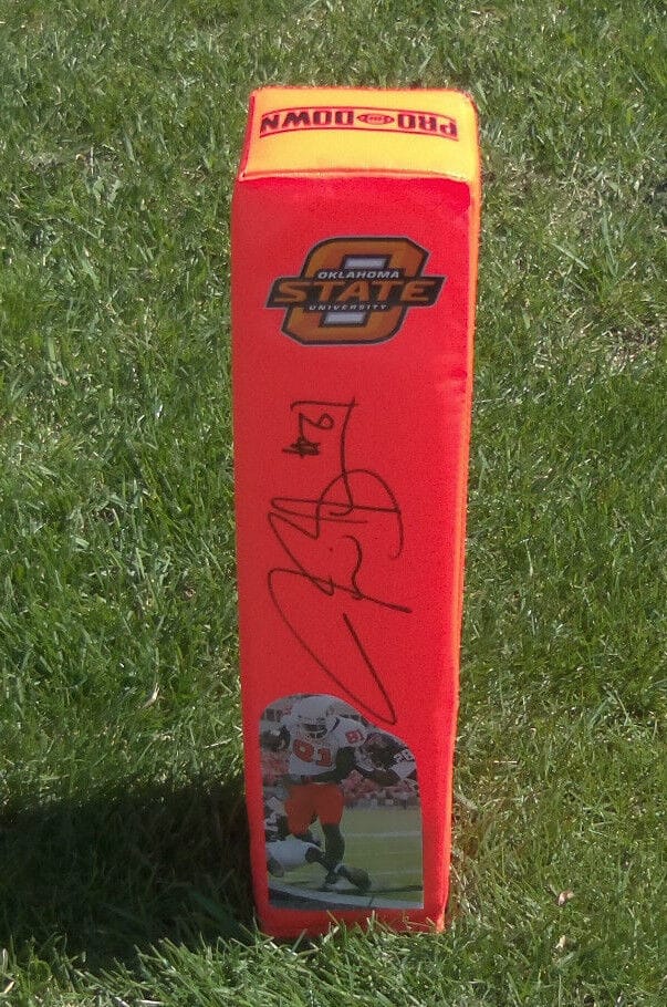 OKLAHOMA STATE #81 JUSTIN BLACKMON SIGNED AUTOGRAPHED FOOTBALL PYLON COA! PROOF! COLLECTIBLE MEMORABILIA