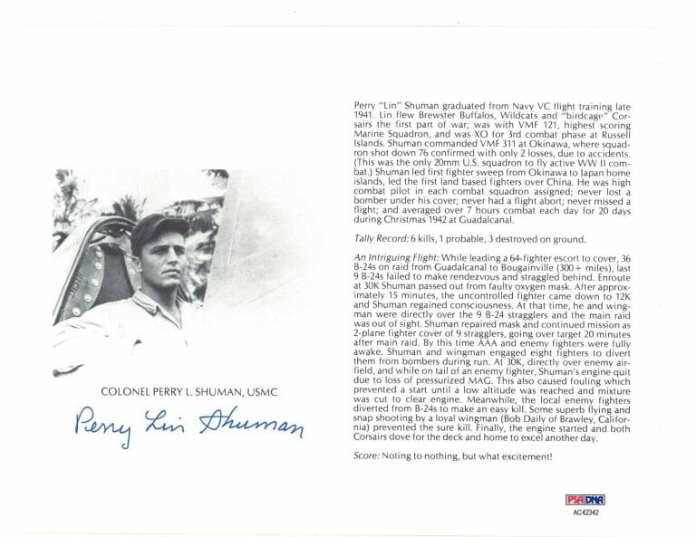 PERRY SHUMAN SIGNED 8X10 (D) PSA DNA AC42342 WWII ACE 6 KILLS COLLECTIBLE MEMORABILIA