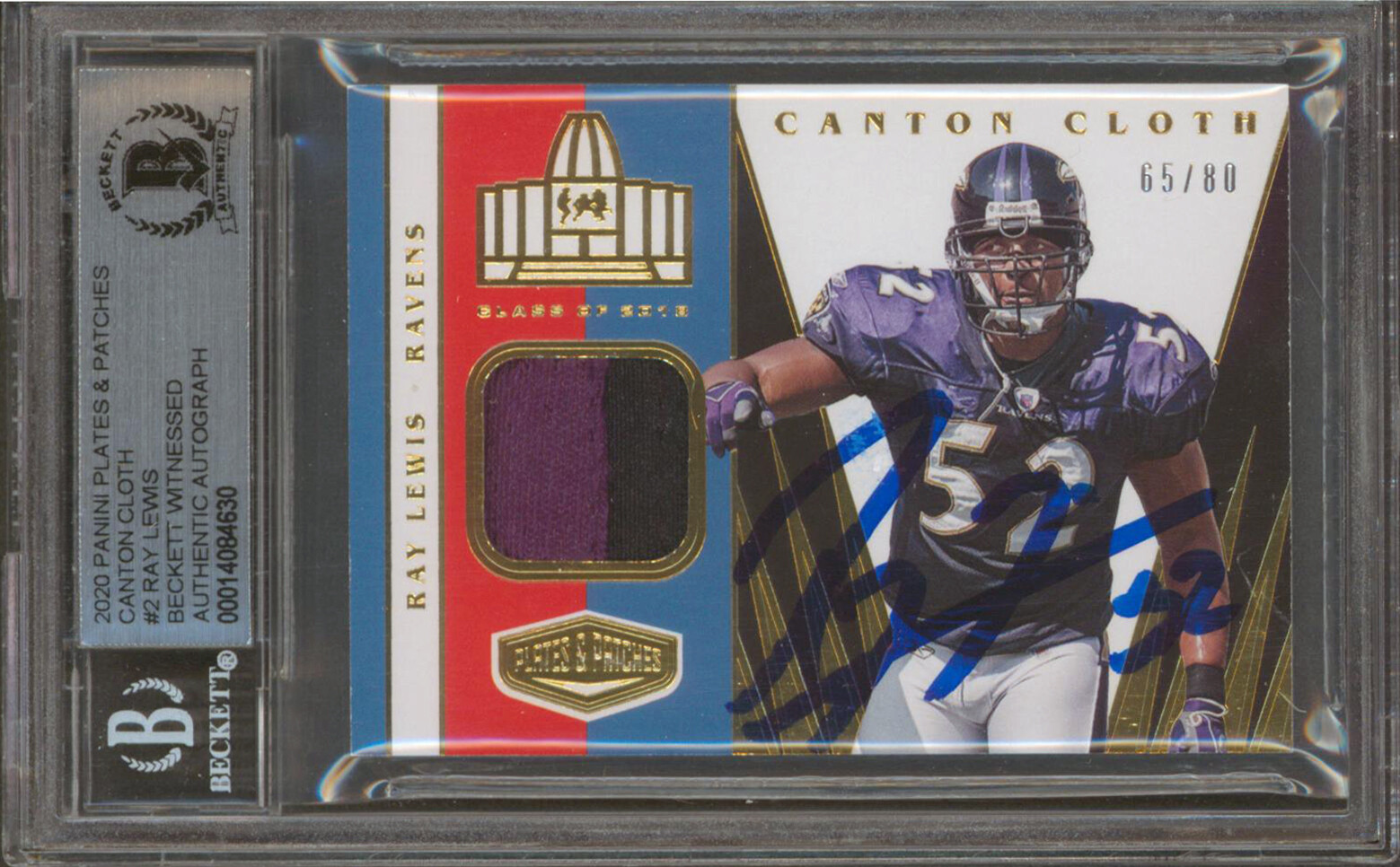 RAVENS RAY LEWIS SIGNED 2020 PANINI P&P CANTON CLOTH #2 65/80 CARD BAS SLABBED COLLECTIBLE MEMORABILIA