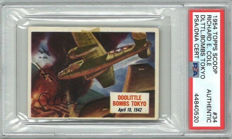 RICHARD COLE SIGNED 1954 TOPPS SCOOP DOOLITTLE BOMBS TOKYO CARD PSA 44840520 (D) COLLECTIBLE MEMORABILIA