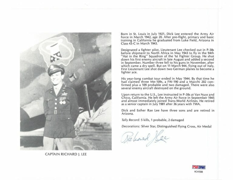 RICHARD LEE SIGNED 8X10 (D) PSA DNA AC41598 WWII ACE 5 KILLS COLLECTIBLE MEMORABILIA