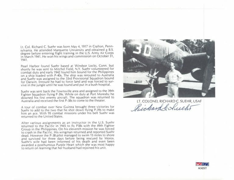 RICHARD SUEHR SIGNED 8X10 (D) PSA DNA AC42377 WWII ACE 5 KILLS COLLECTIBLE MEMORABILIA