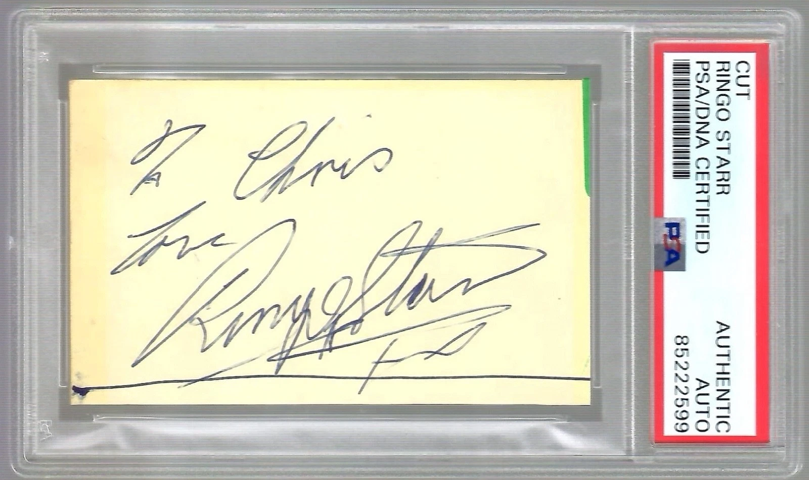 RINGO STARR SIGNED 2×3 VINTAGE CUT SIGNATURE FULL SIG TO CHRIS PSA SLABBED COLLECTIBLE MEMORABILIA