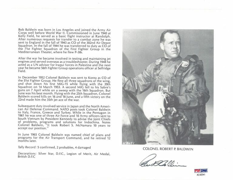ROBERT BALDWIN SIGNED 8X10 (D) PSA DNA AC42041 KOREAN WAR ACE 5V COLLECTIBLE MEMORABILIA