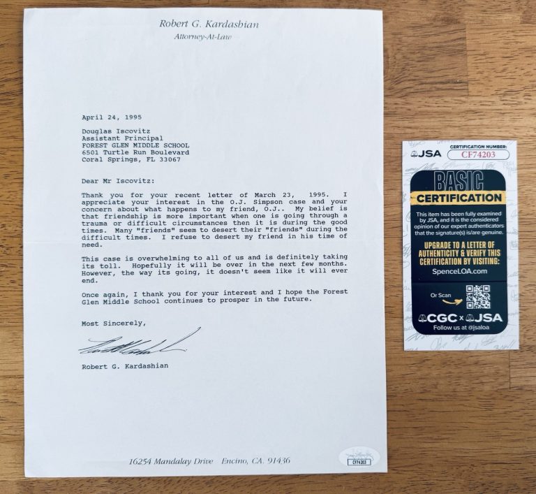 ROBERT KARDASHIAN TYPED LETTER SIGNED DATED DURING OJ SIMPSON TRIAL CONTENT JSA COLLECTIBLE MEMORABILIA