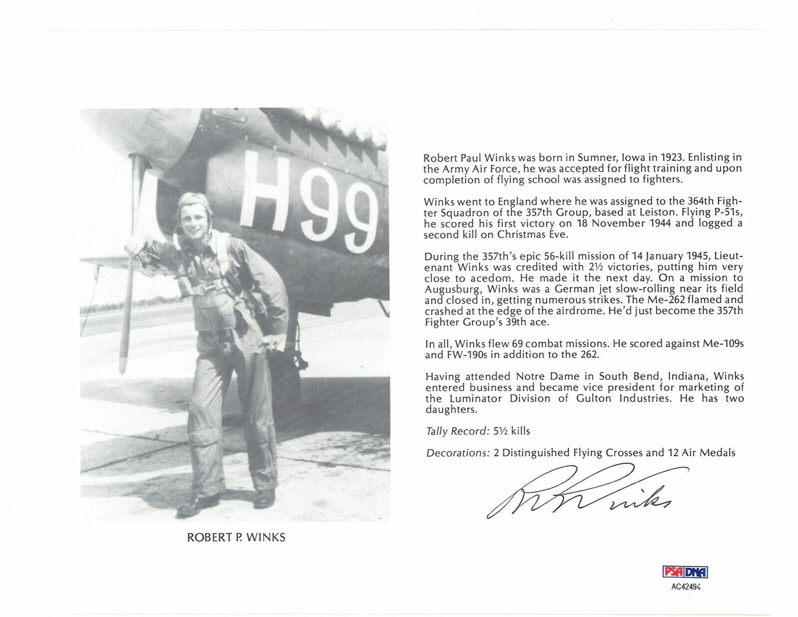 ROBERT WINKS SIGNED 8X10 (D) PSA DNA AC42494 WWII ACE 5.5 KILLS COLLECTIBLE MEMORABILIA