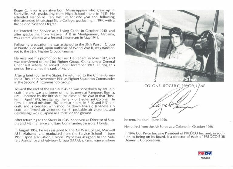 ROGER PRYOR SIGNED 8X10 (D) PSA DNA AC42863 WWII ACE 5 KILLS COLLECTIBLE MEMORABILIA