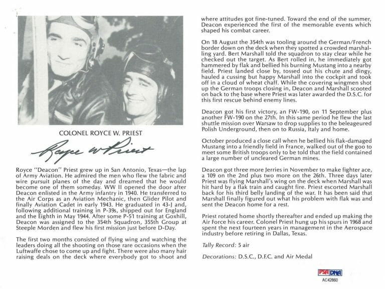ROYCE PRIEST SIGNED 8X10 (D) PSA DNA AC42860 WWII ACE 5 KILLS COLLECTIBLE MEMORABILIA