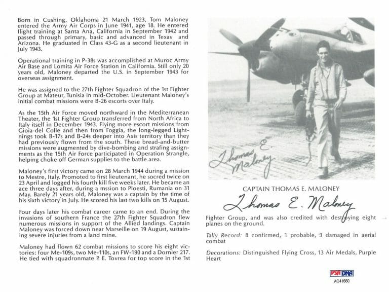 THOMAS MALONEY SIGNED 8X10 (D) PSA DNA AC41660 WWII ACE 8 KILLS COLLECTIBLE MEMORABILIA