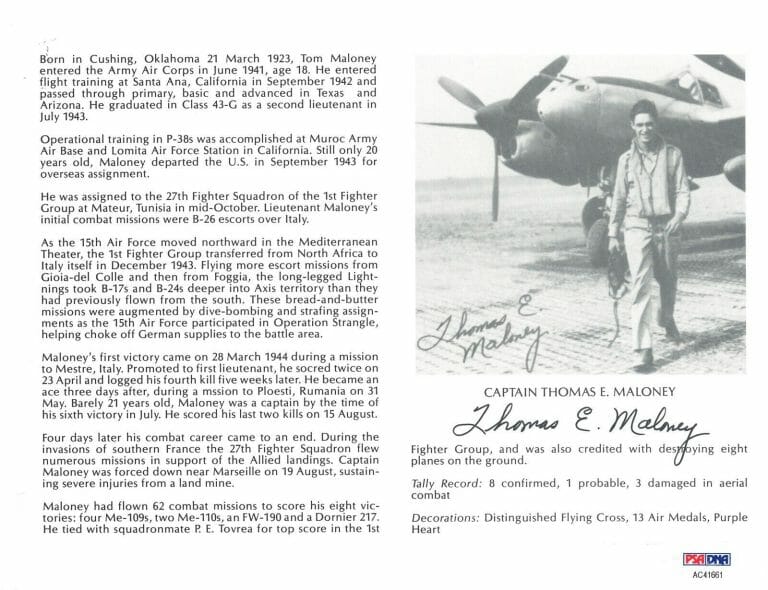 THOMAS MALONEY SIGNED 8X10 (D) PSA DNA AC41661 WWII ACE 8 KILLS COLLECTIBLE MEMORABILIA