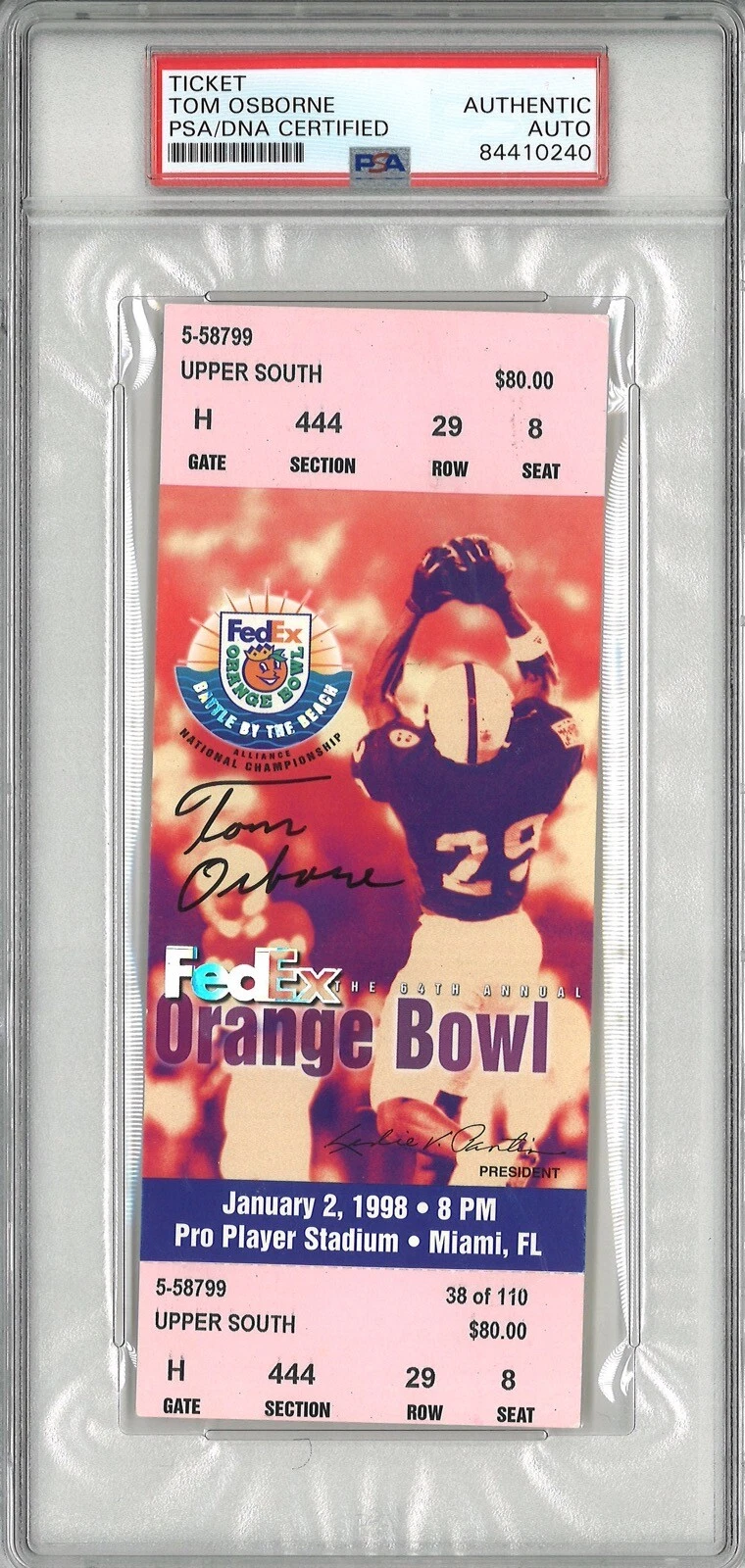 TOM OSBORNE SIGNED 1998 ORANGE BOWL TICKET PSA DNA 1/2/1998 HUSKERS CHAMPS COLLECTIBLE MEMORABILIA