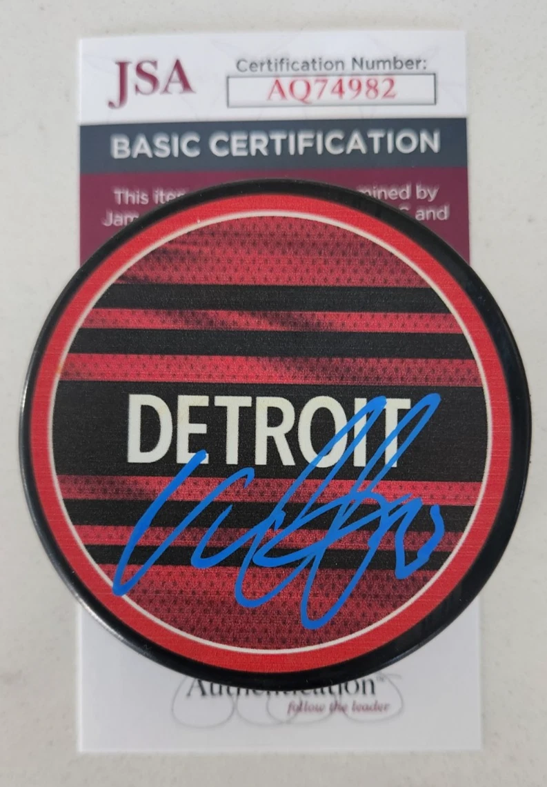 VILLE HUSSO SIGNED REVERSE RETRO PUCK W/ JSA COA #AQ74982 DETROIT RED WINGS COLLECTIBLE MEMORABILIA