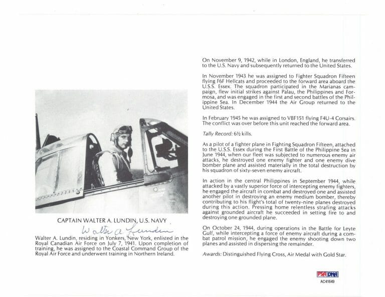 WALTER LUNDIN SIGNED 8X10 (D) PSA DNA AC41649 WWII ACE 6.5 KILLS COLLECTIBLE MEMORABILIA