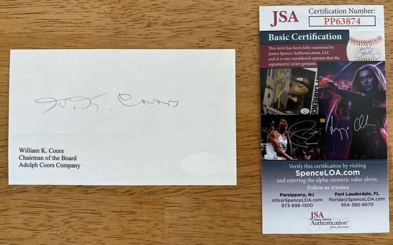 WILLIAM COORS SIGNED AUTOGRAPHED 3×5 CARD JSA CERTIFIED COORS BEER CEO COLLECTIBLE MEMORABILIA