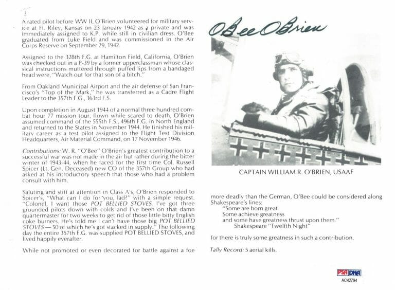 WILLIAM OBEE O’BRIEN SIGNED 8X10 (D) PSA DNA AC42794 WWII ACE 5 KILLS COLLECTIBLE MEMORABILIA