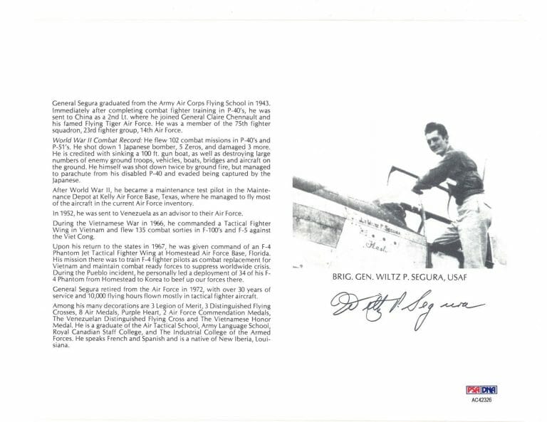 WILTZ SEGURA SIGNED 8X10 (D) PSA DNA AC42326 WWII ACE 6 KILLS COLLECTIBLE MEMORABILIA