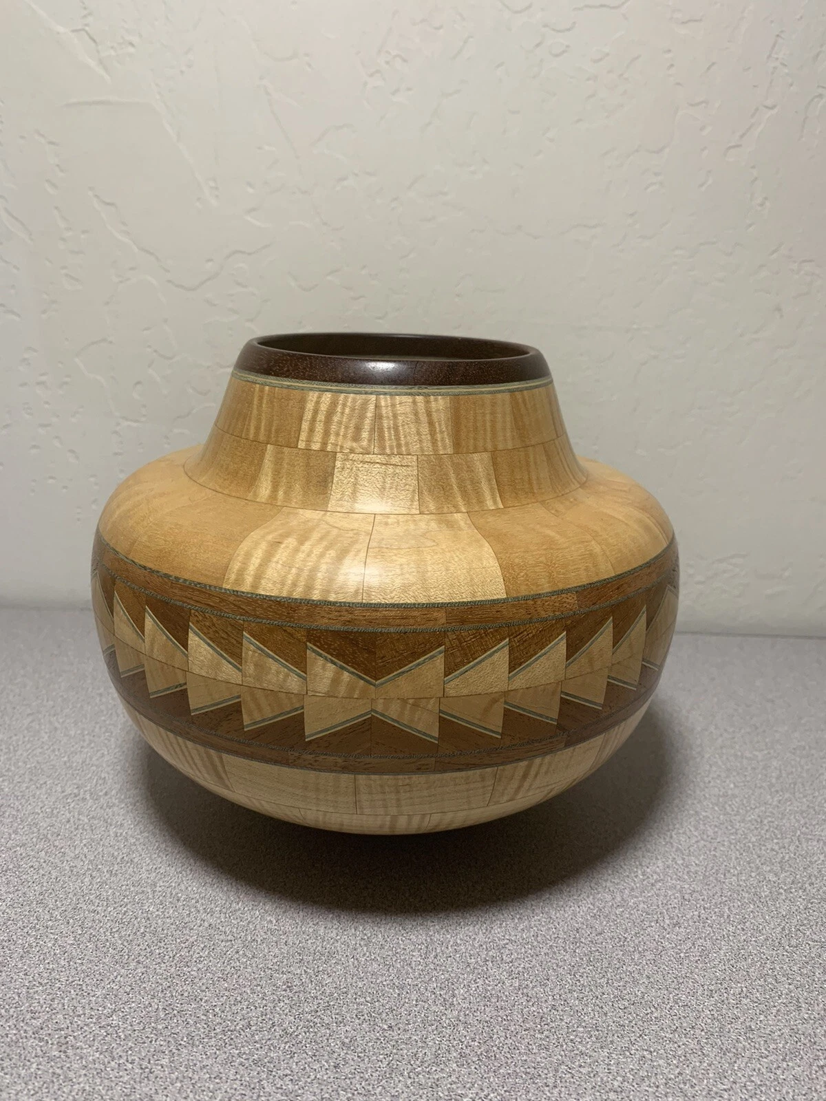 WOODEN TAPESTRY MOSAIC INLAY VASE BOWL HANDMADE A MIRMAR COLLECTIBLE MEMORABILIA