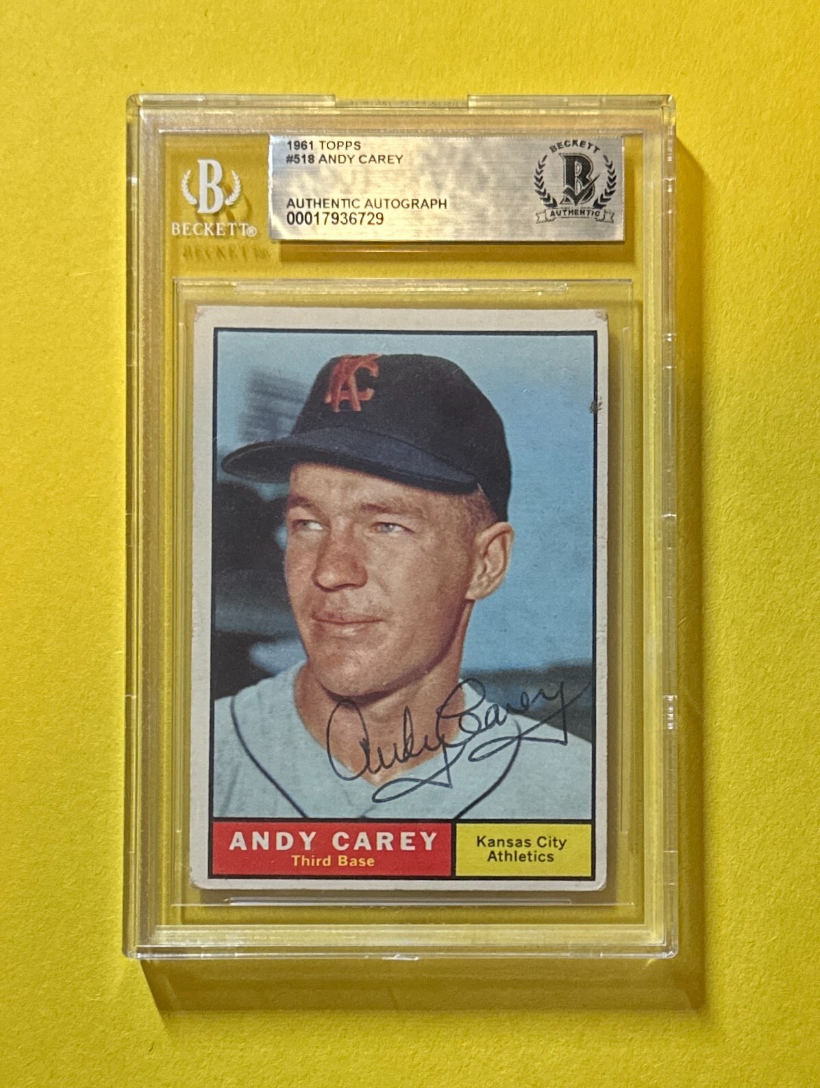 1961 TOPPS ANDY CAREY #518 BECKETT AUTHENTIC SIGNED AUTOGRAPHED CARD ATHLETICS COLLECTIBLE MEMORABILIA
