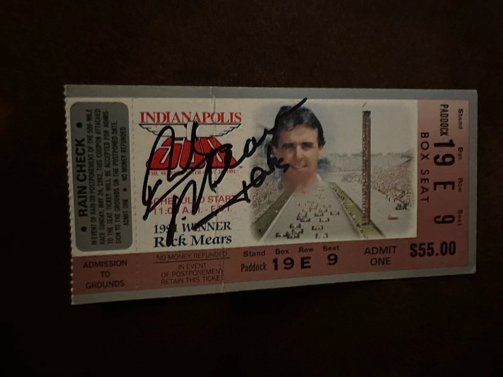 1992 INDY 500 RICK MEARS SIGNED TICKET STUB (1991 INDY RACE WINNER) CREASE COLLECTIBLE MEMORABILIA