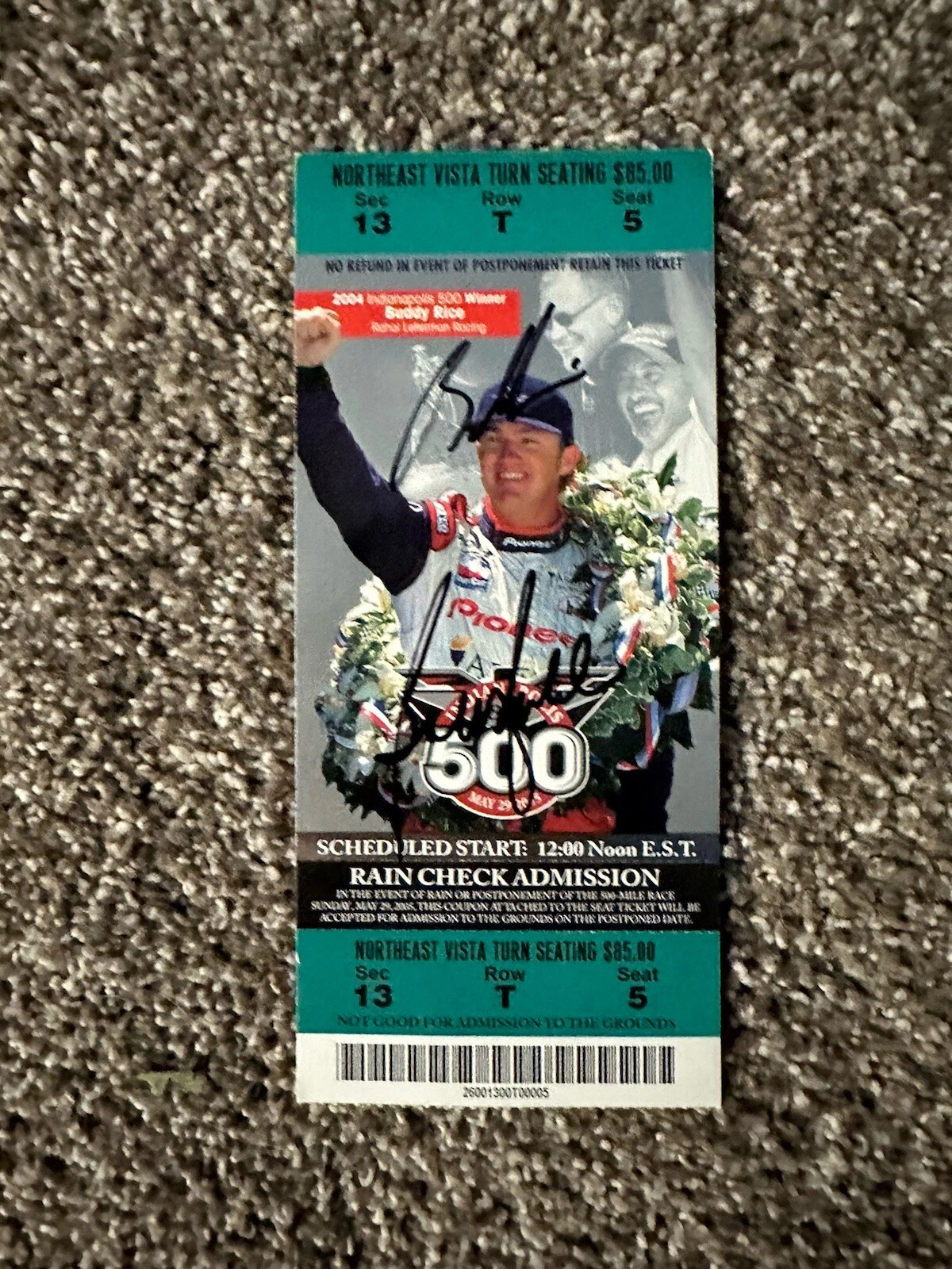 2005 INDY 500 BOBBY RAHAL SIGNED TICKET STUB INDIANAPOLIS 2004 BUDDY RICE WINNER COLLECTIBLE MEMORABILIA