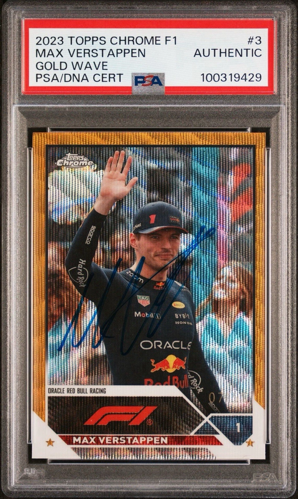 2023 TOPPS CHROME F1 #3 MAX VERSTAPPEN GOLD WAVE REFRACTOR AUTO /50 PSA/DNA DUAL COLLECTIBLE MEMORABILIA