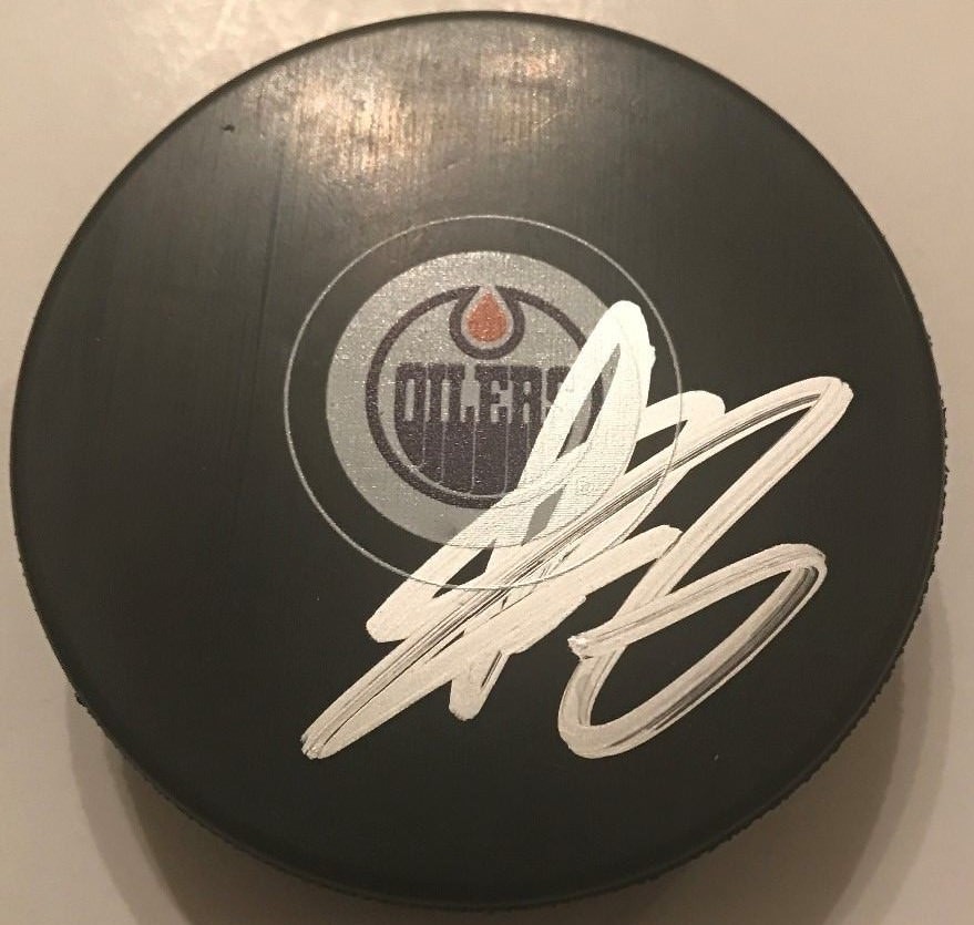 ADAM LARSSON SIGNED EDMONTON OILERS PUCK W/CASE COA COLLECTIBLE MEMORABILIA