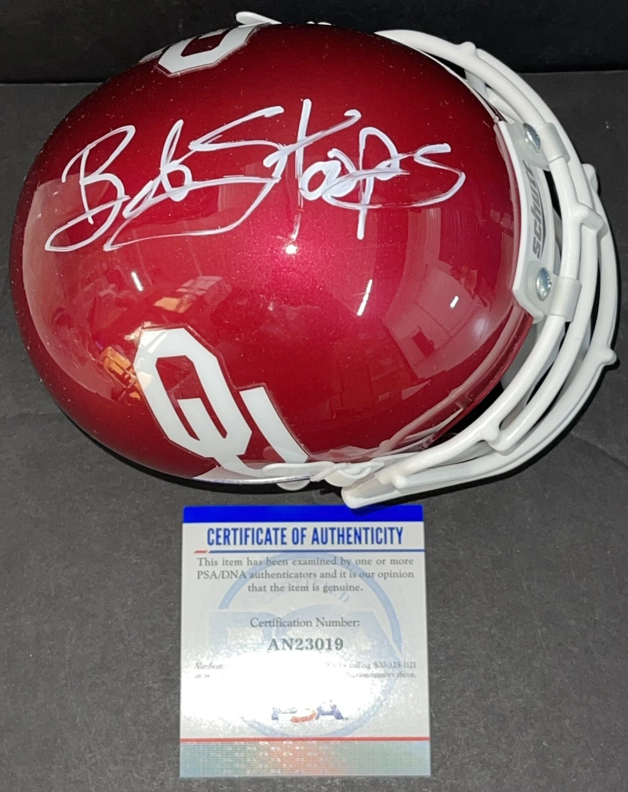 BOB STOOPS SIGNED AUTOGRAPHED OKLAHOMA SOONERS MINI HELMET BOOMER PSA/DNA COLLECTIBLE MEMORABILIA