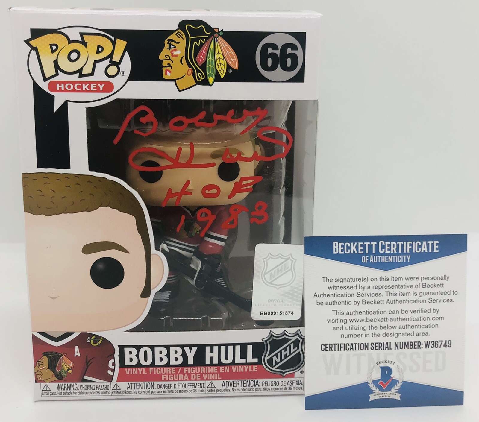 BOBBY HULL SIGNED POP FUNKO FIGURE NHL LEGEND CHICAGO BLACKHAWKS PROOF BAS COA COLLECTIBLE MEMORABILIA