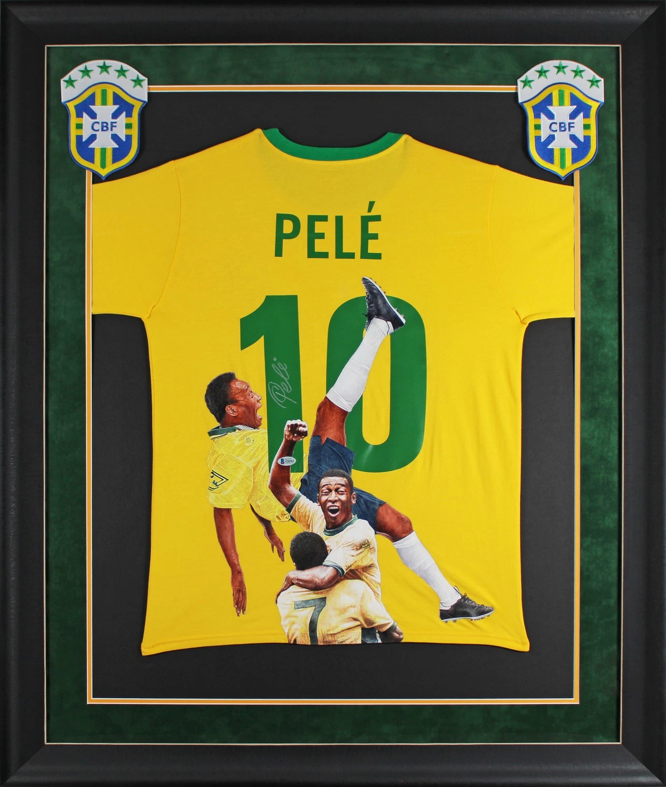 BRAZIL PELE SIGNED HAND PAINTED LE 1/1 BY WILLIAM ZAVALA FRAMED JERSEY BAS COA COLLECTIBLE MEMORABILIA