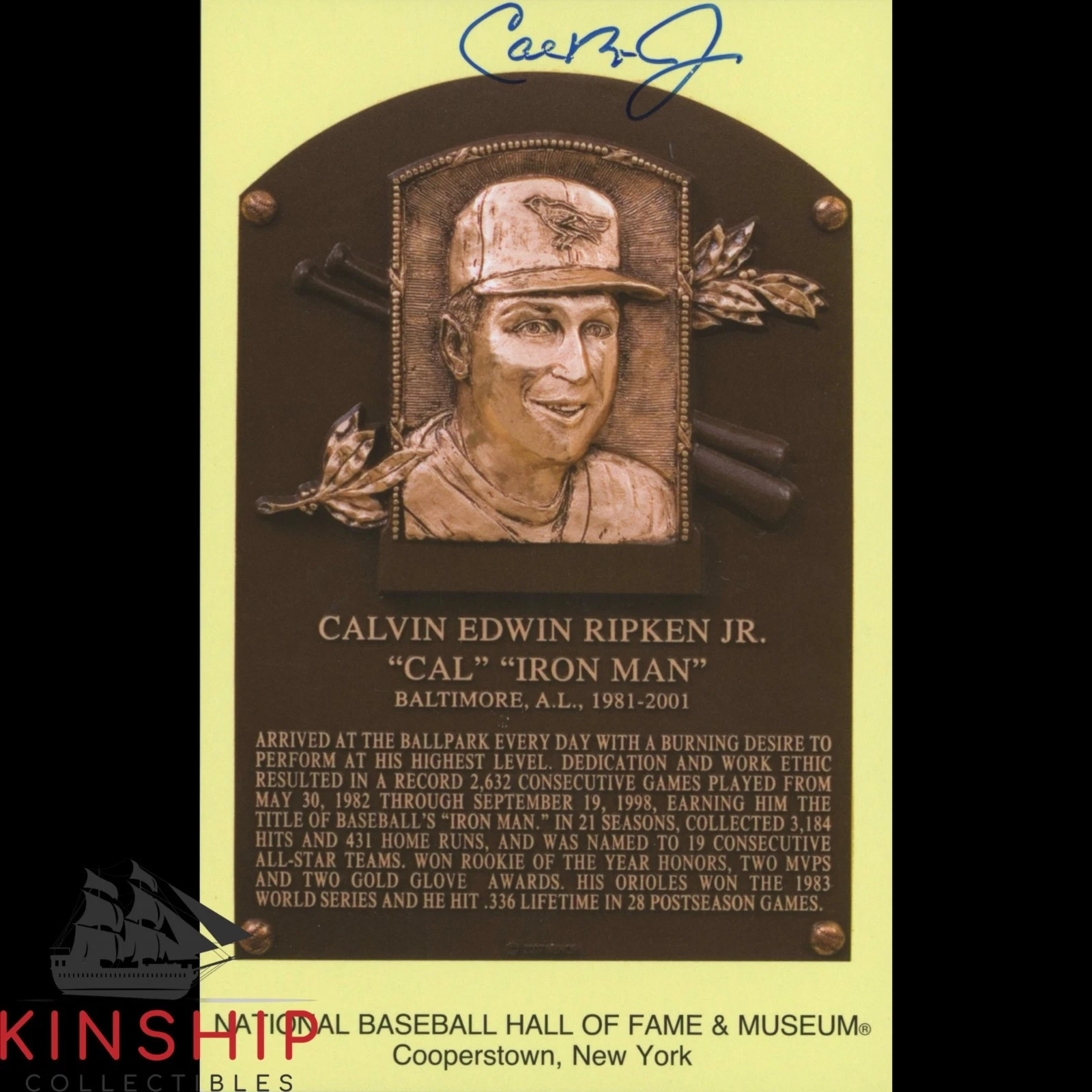 CAL RIPKEN JR SIGNED HOF PLAQUE POSTCARD JSA COA ORIOLES HALL OF FAME AUTO Z2395 COLLECTIBLE MEMORABILIA
