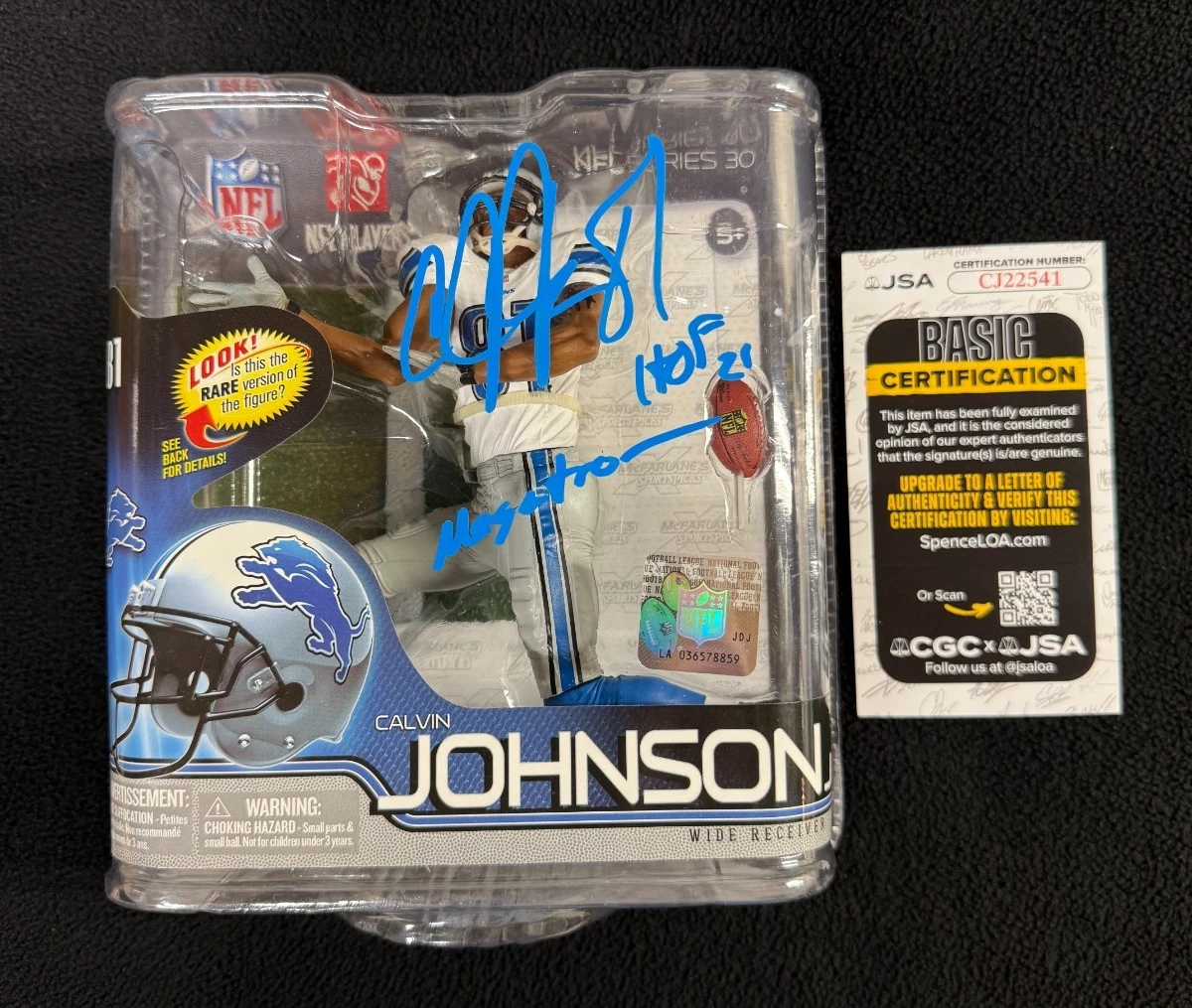 CALVIN JOHNSON SIGNED & INSCRIBED DETROIT LIONS MCFARLANE ACTION FIGURE JSA COA COLLECTIBLE MEMORABILIA