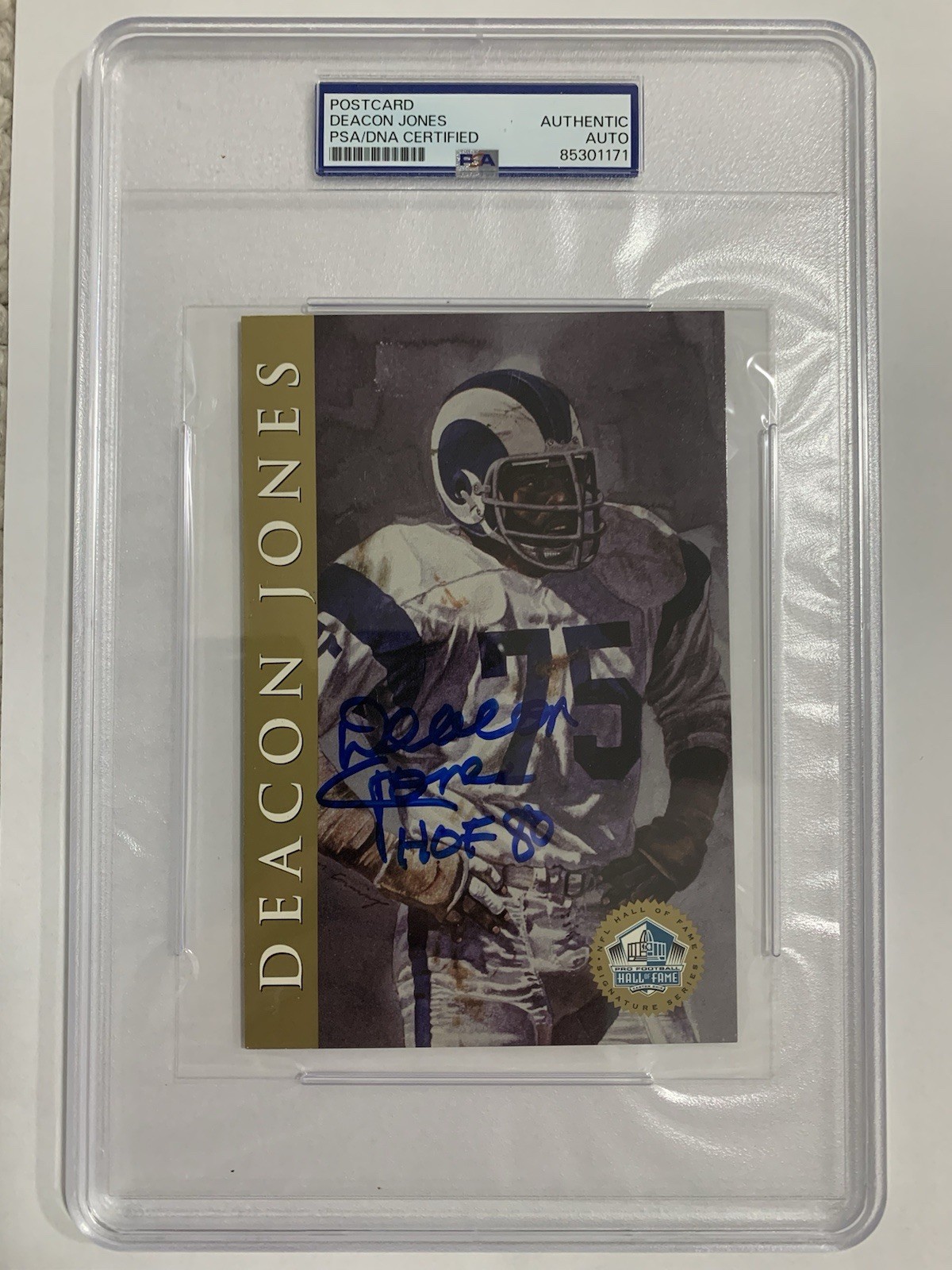 DEACON JONES SIGNED HALL OF FAME POST CARD LA RAMS LEGEND PSA SLABBED COLLECTIBLE MEMORABILIA