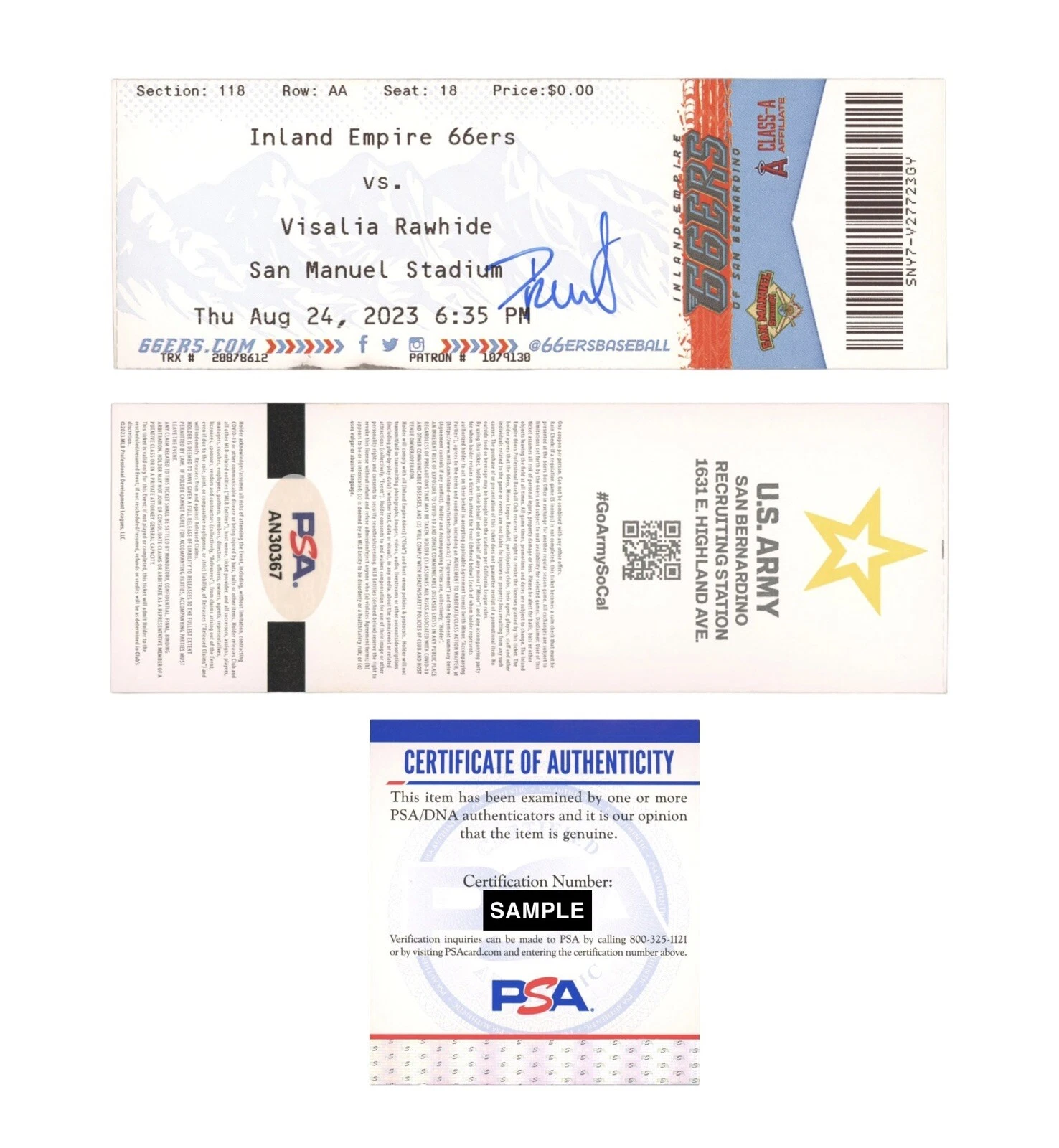 DRUW JONES SIGNED FIRST MILB PROFESSIONAL HOME RUN TICKET STUB 8/24/23 PSA/DNA COLLECTIBLE MEMORABILIA