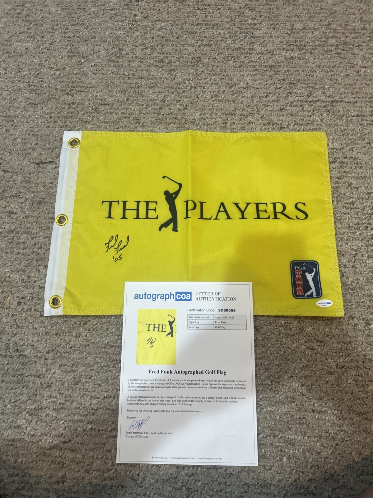 FRED FUNK SIGNED AUTOGRAPH THE PLAYERS GOLF PIN FLAG ACOA LETTER COA PGA COLLECTIBLE MEMORABILIA