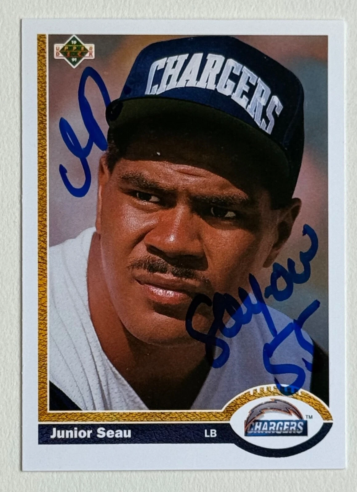 JUNIOR SEAU SAY-OW 1991 UPPER DECK SIGNED AUTOGRAPHED RC ROOKIE WITH COA RARE COLLECTIBLE MEMORABILIA