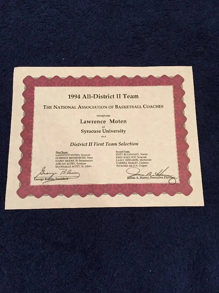 LAWRENCE MOTEN 1994 ALL DISTRICT TEAM AWARD SYRACUSE BASKETBALL COLLECTIBLE MEMORABILIA