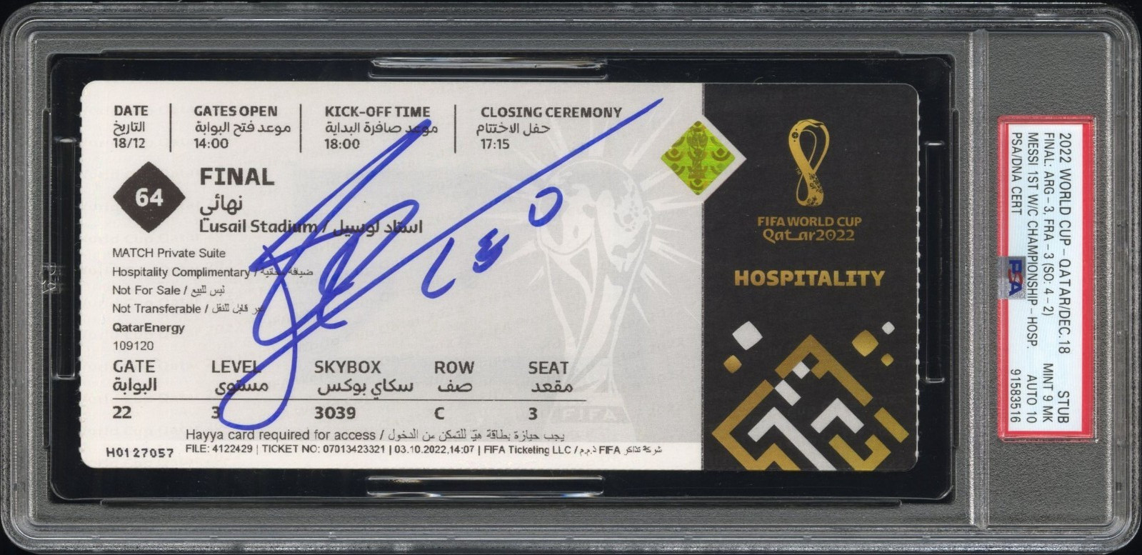 LIONEL MESSI SIGNED 2022 WORLD CUP FINAL WINNER FULL MATCH TICKET PSA 9 AUTO 10 COLLECTIBLE MEMORABILIA