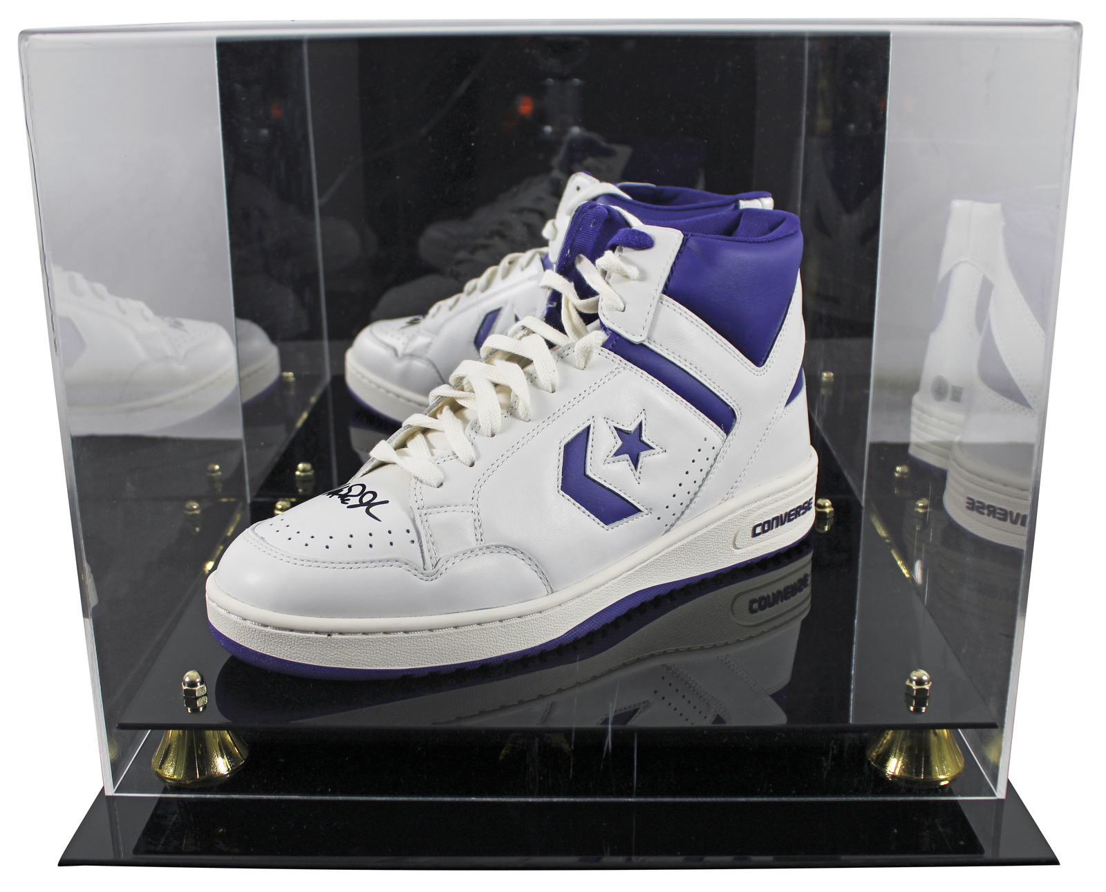 MAGIC JOHNSON SIGNED LEFT PURPLE & WHITE CONVERSE WEAPON SHOE W/ CASE BAS WIT 2 COLLECTIBLE MEMORABILIA