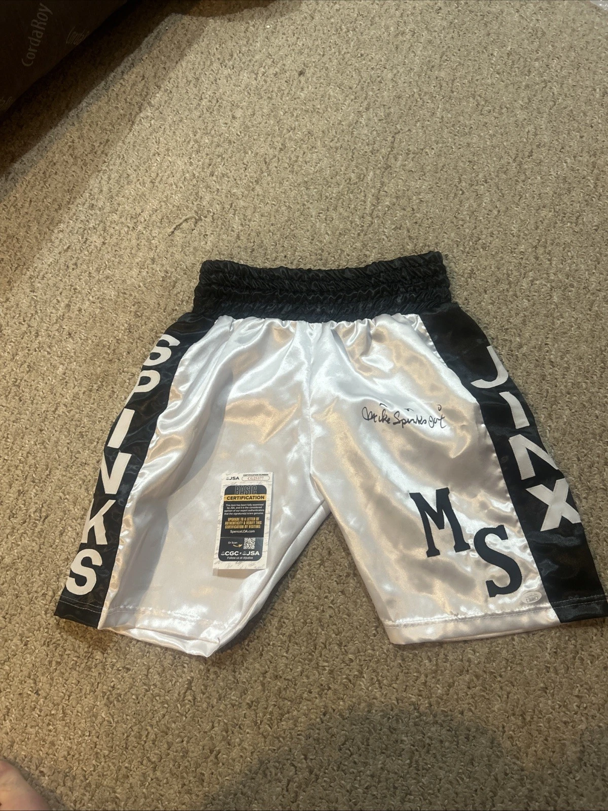 MIKE MICHAEL SPINKS JINX SIGNED AUTOGRAPH BOXING TRUNKS SHORTS JSA COA BOXER HOF COLLECTIBLE MEMORABILIA