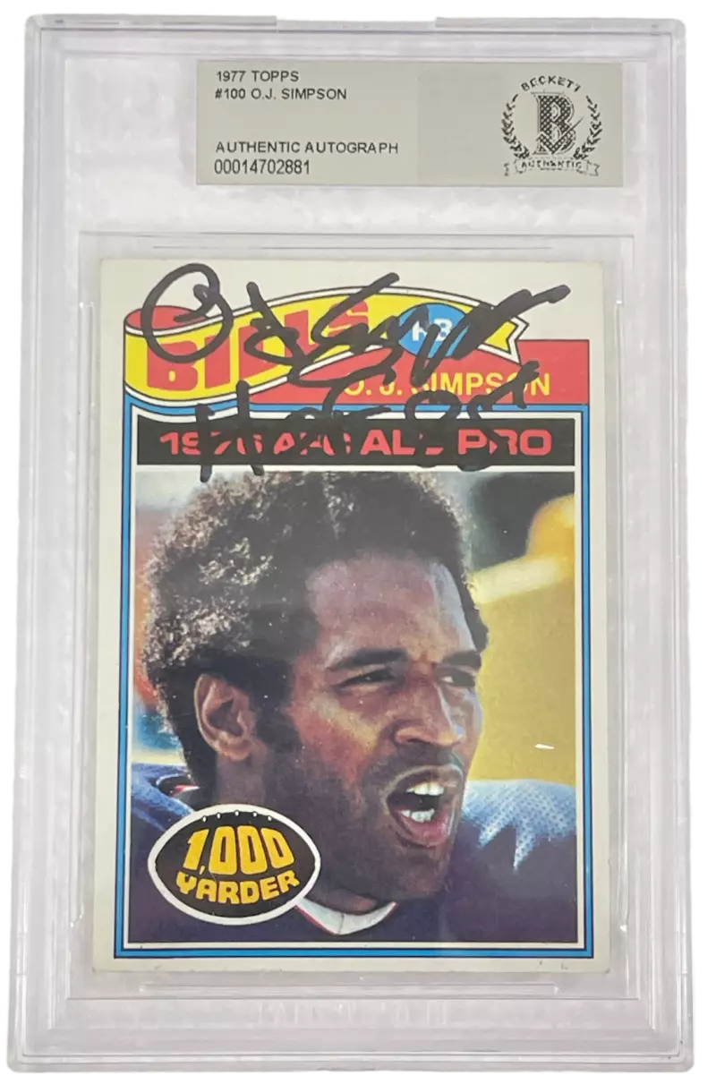 OJ SIMPSON SIGNED 1977 TOPPS #100 CARD AUTOGARPHED HOF INSCRIPT BILLS BECKETT COLLECTIBLE MEMORABILIA