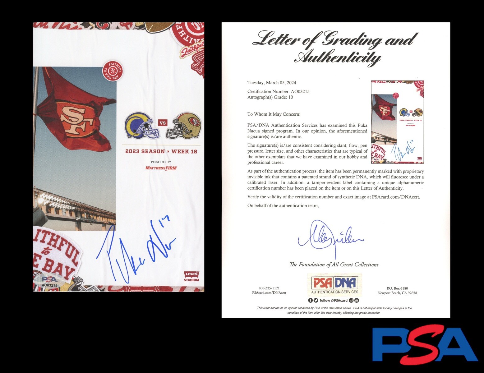 PUKA NACUA SIGNED NFL ROOKIE RECORD YARDS + RECEPTIONS PROGRAM 10 AUTO PSA LOA COLLECTIBLE MEMORABILIA