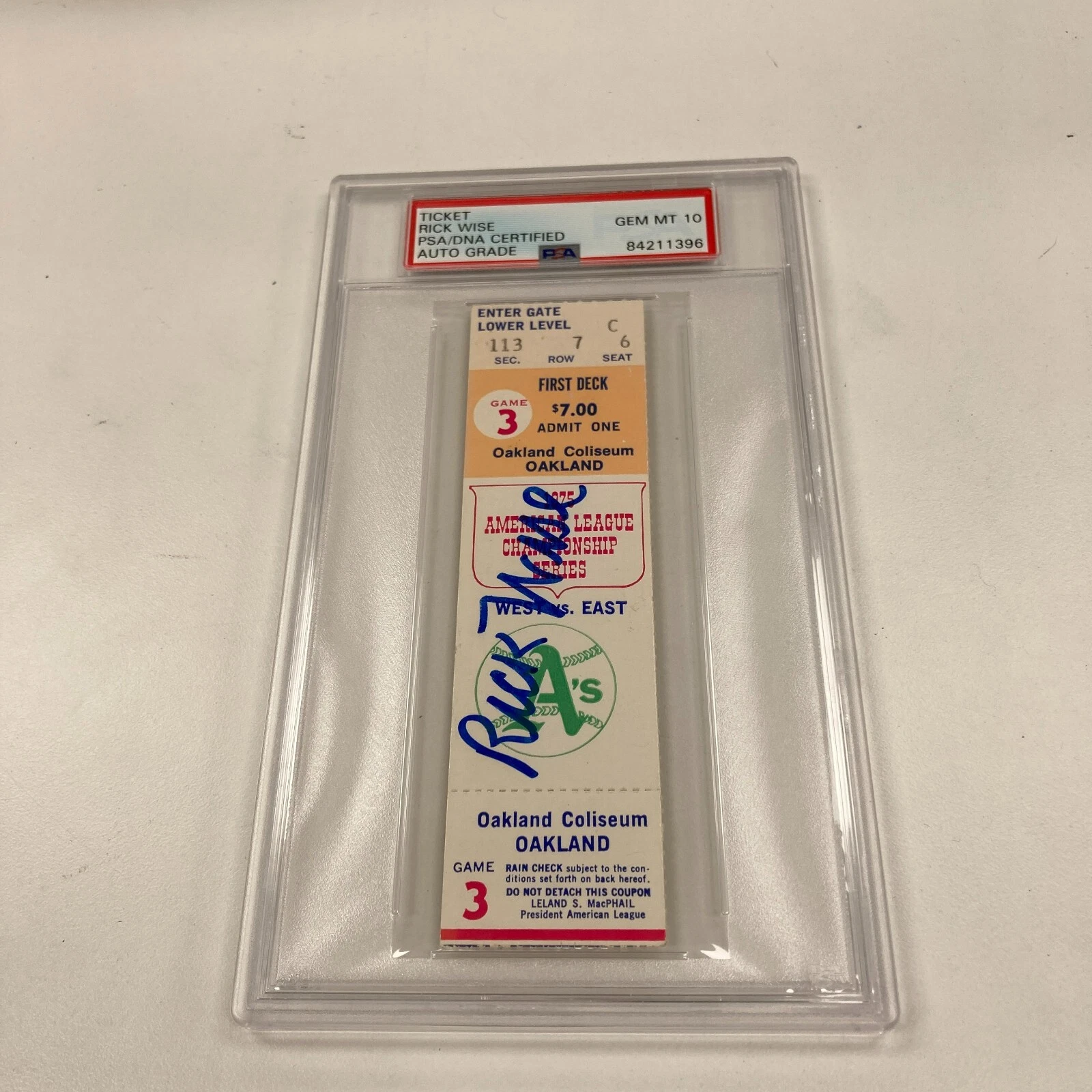 RICK WISE SIGNED 1975 ALCS GAME 3 TICKET PSA DNA GEM MINT 10 COLLECTIBLE MEMORABILIA