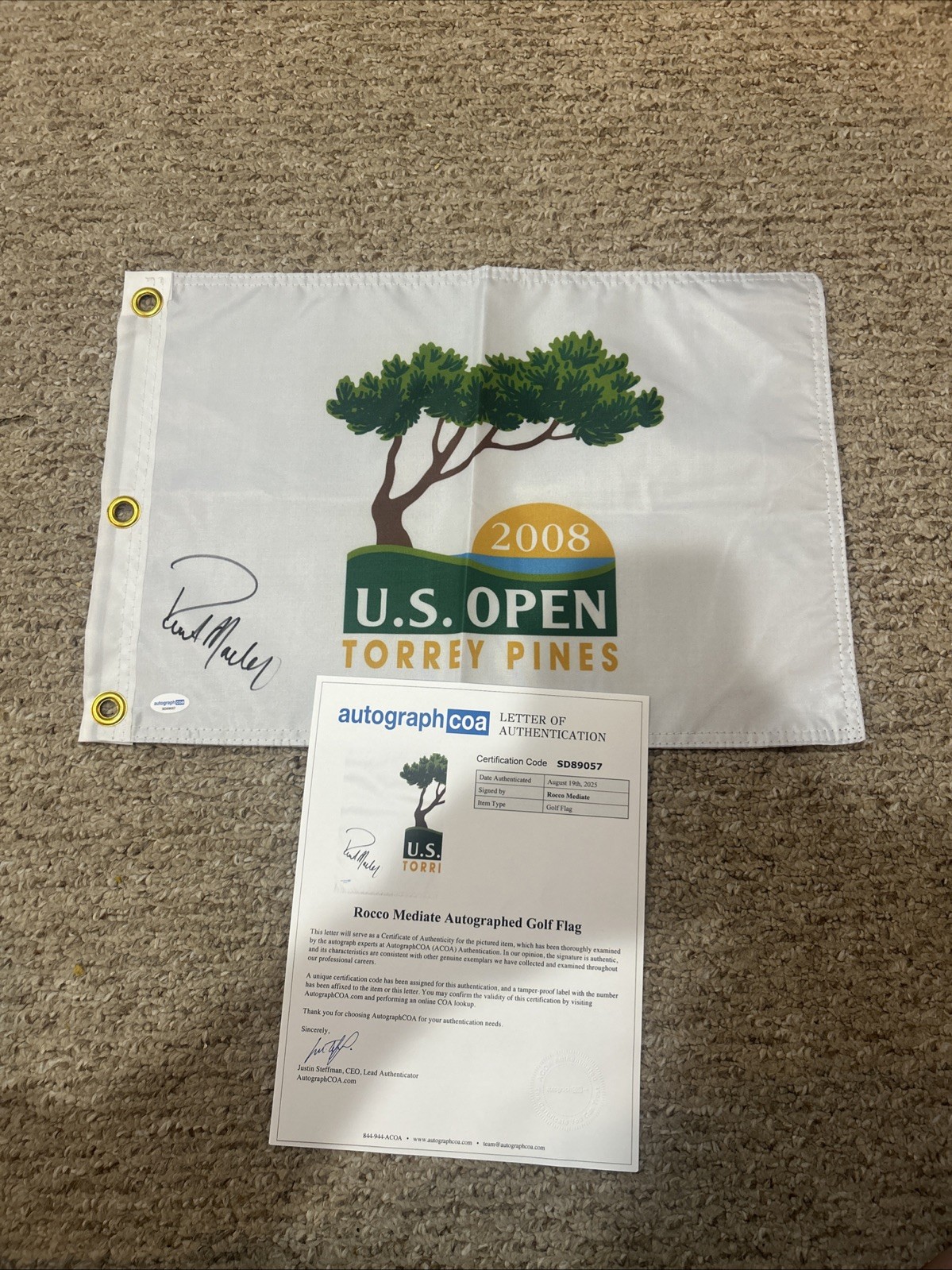 ROCCO MEDIATE SIGNED AUTOGRAPH 2008 US OPEN GOLF PIN FLAG ACOA LETTER COA TIGER COLLECTIBLE MEMORABILIA