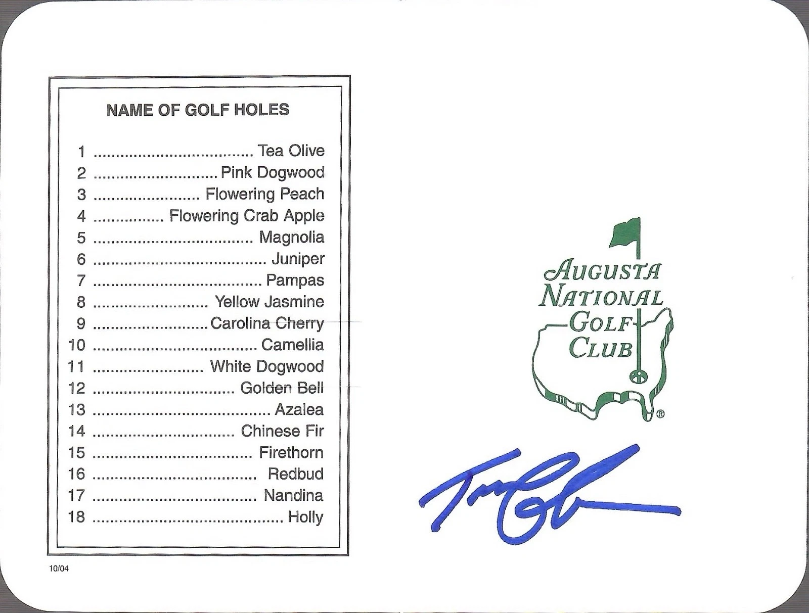 TOM LEHMAN HAND SIGNED UNUSED MASTERS SCORECARD+COA 1996 OPEN CHAMPION COLLECTIBLE MEMORABILIA
