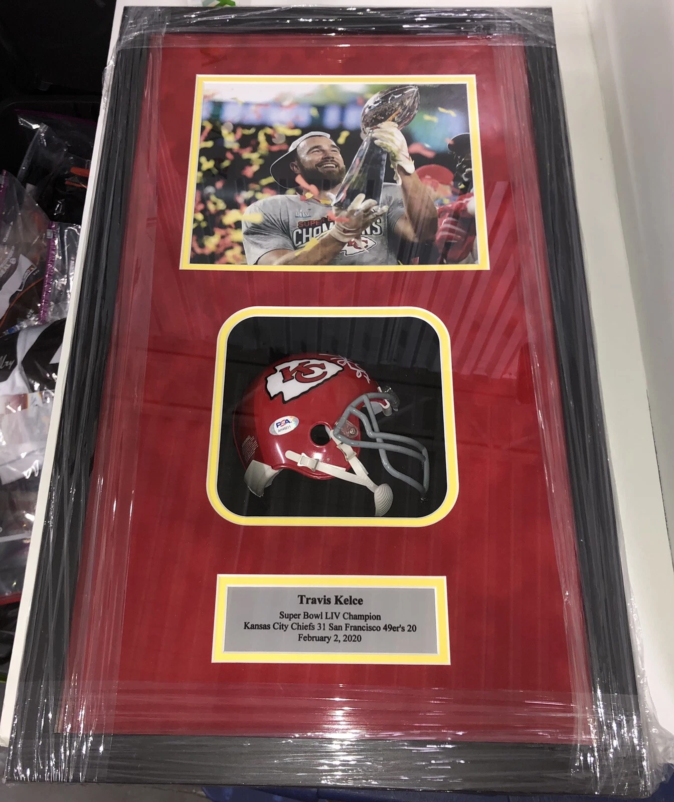 TRAVIS KELCE SIGNED CUSTOM FRAMED SHADOWBOXED KANSAS CITY MINI HELMET PSA/DNA COLLECTIBLE MEMORABILIA