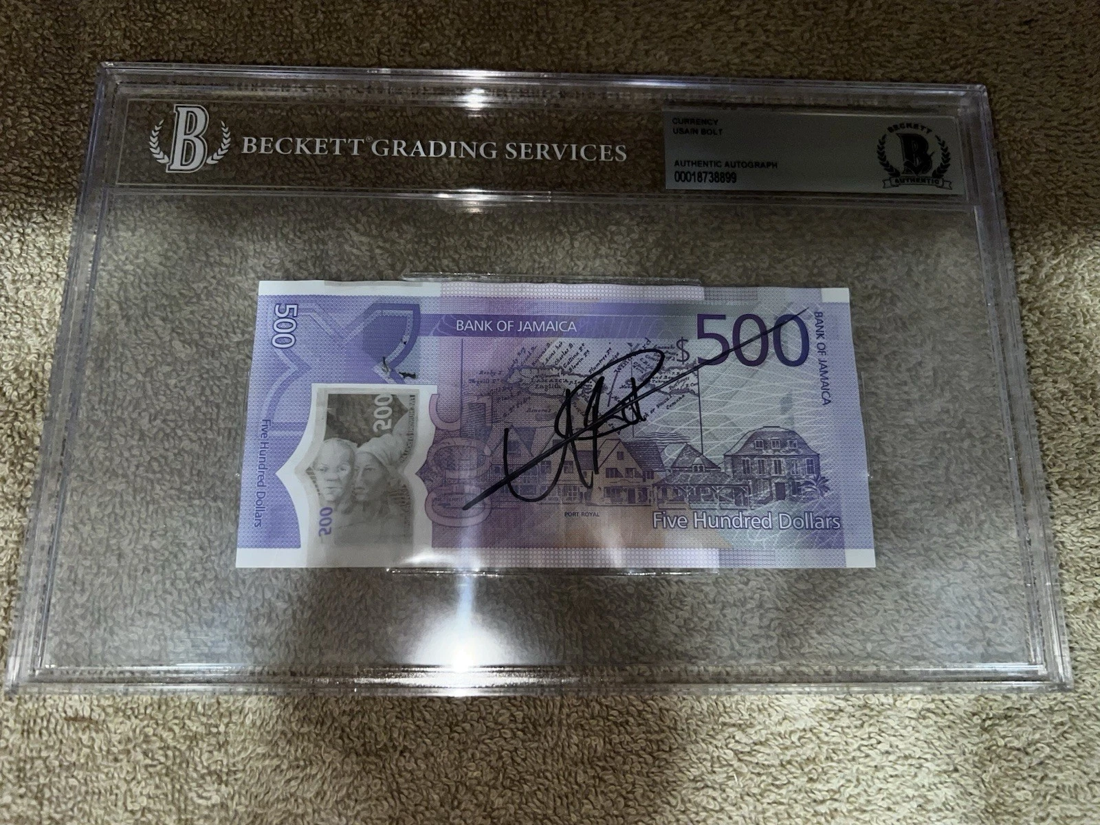 USAIN BOLT SIGNED OFFICIAL JAMAICAN CURRENCY 500 DOLLARS OLYMPIC LEGEND BAS COLLECTIBLE MEMORABILIA