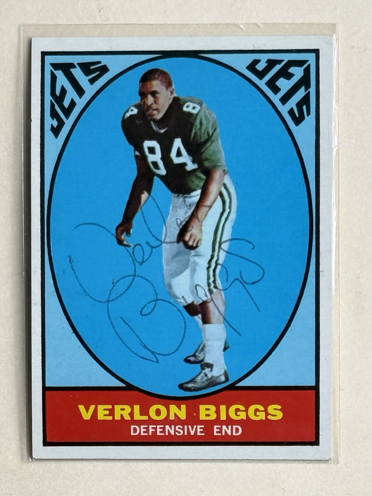 VERLON BIGGS SIGNED AUTOGRAPHED AUTO NY JETS 1967 TOPPS CARD RARE SUPER BOWL 3 COLLECTIBLE MEMORABILIA