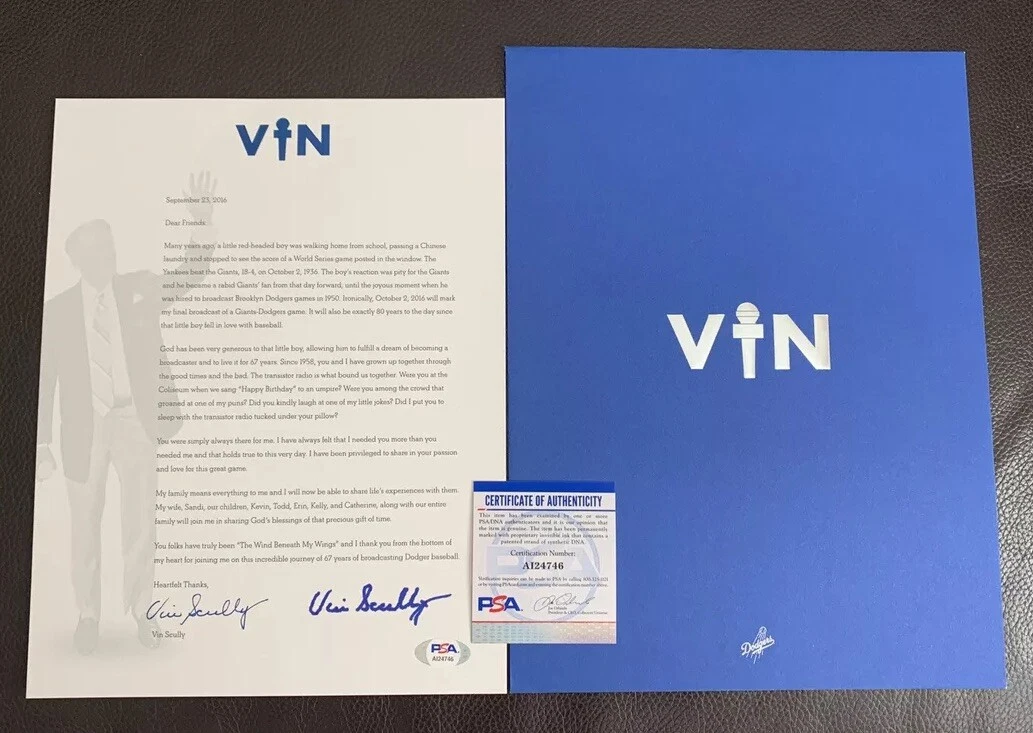 VIN SCULLY SIGNED RETIREMENT LETTER PSA/DNA COA LOS ANGELES DODGERS 67 YEARS COLLECTIBLE MEMORABILIA