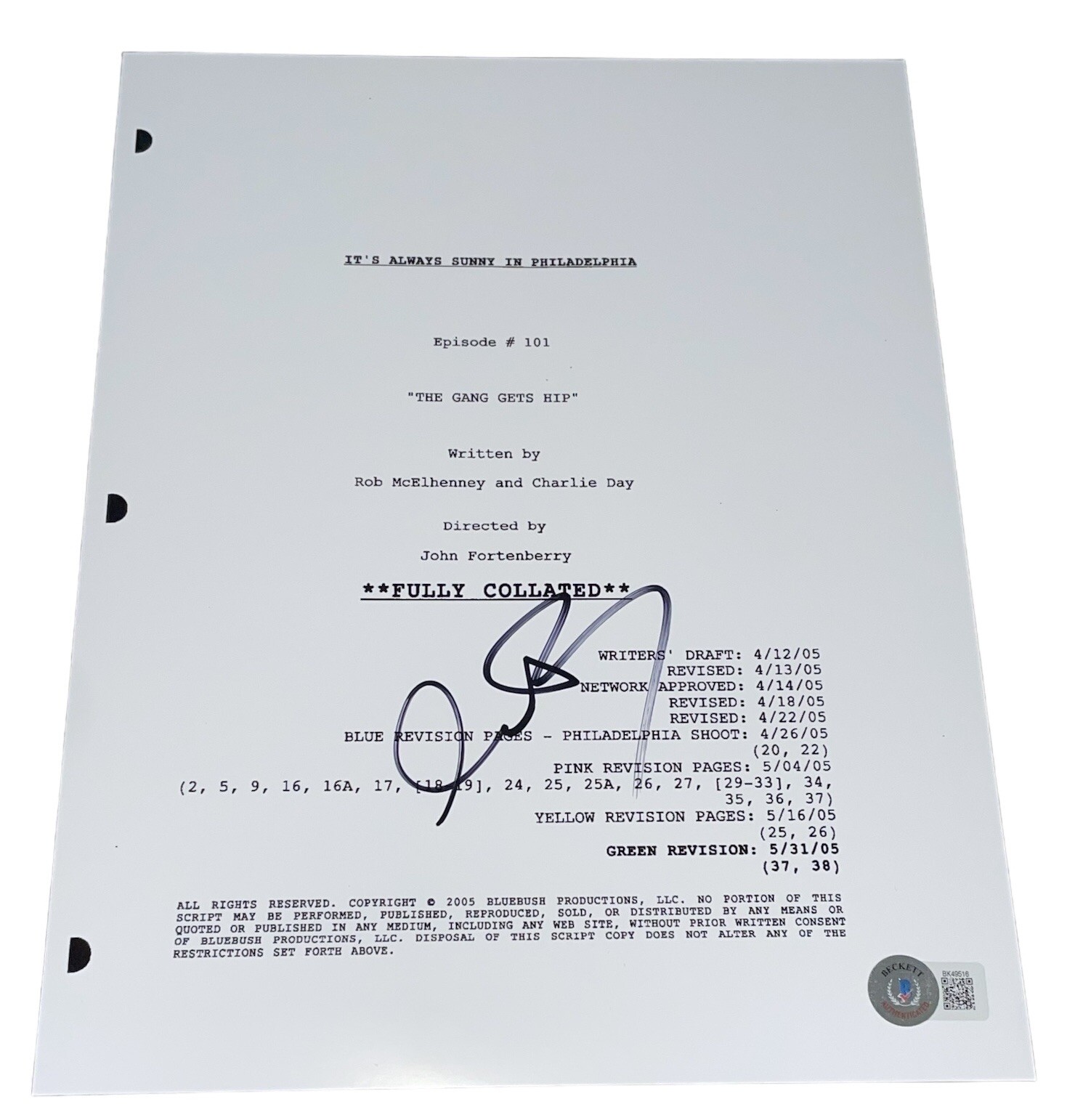 CHARLIE DAY SIGNED IT’S ALWAYS SUNNY IN PHILADELPHIA FULL TV PILOT SCRIPT BAS COLLECTIBLE MEMORABILIA