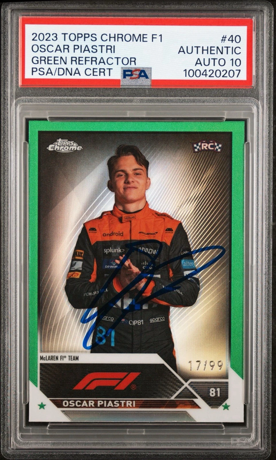 2023 TOPPS CHROME F1 #40 OSCAR PIASTRI GREEN REF ROOKIE /99 PSA GEM 10 AUTO RC COLLECTIBLE MEMORABILIA